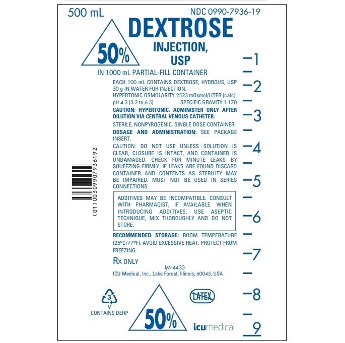 50% Dextrose IV Solution Injection, 500 mL in 1000 mL Partial-Fill Bag, Latex-free, 12/Case (Expiring)