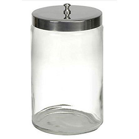 Clear glass sundry jars keep applicators, cotton, tongue depressors, gauze and bandages in plain sight and right at your fingertips. They feature stainless-steel covers. Each jar is 7? deep, 4 1/4? diameter.